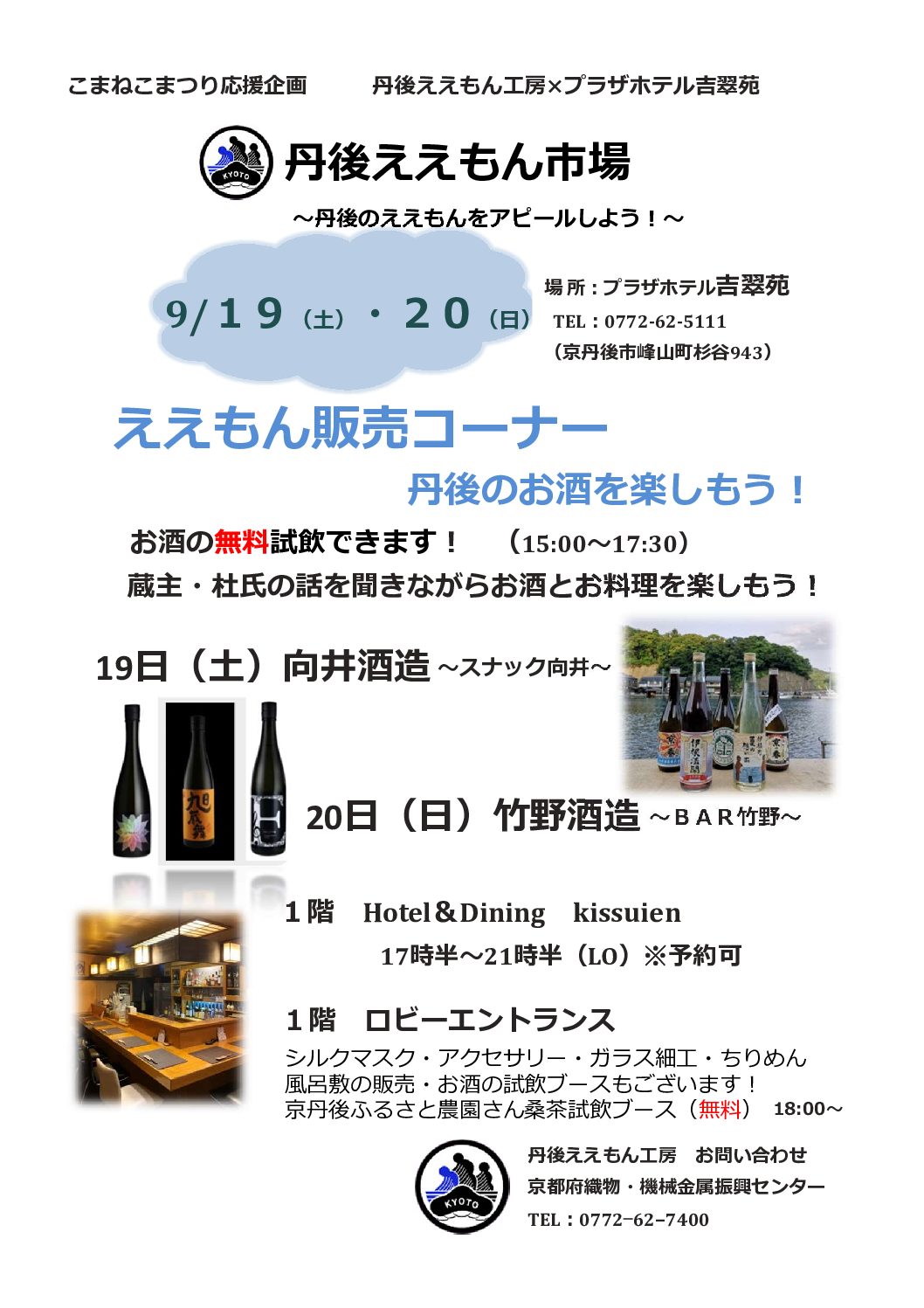 9月19日(土)~9月22日(祝火)に開催されるこまねこ祭りの応援企画として、はじめの2日間でプラザホテル吉翠苑さんの場所をお借りして、丹後ええもん工房の食の工房(向井酒造・竹野酒造・京丹後ふるさと農園)によるお酒・桑茶の試飲を行います。また、レストランではお酒に合わせたお料理も楽しめます。1Fエントランスではマスク・バッグ・アクセサリー・コースター・風呂敷など他にも様々な商品を出店いたします。