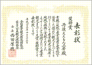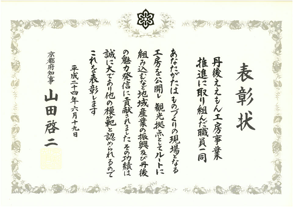 地域産業の振興及び丹後の魅力発信に貢献したとして、京都府知事より表彰されました。
